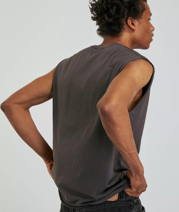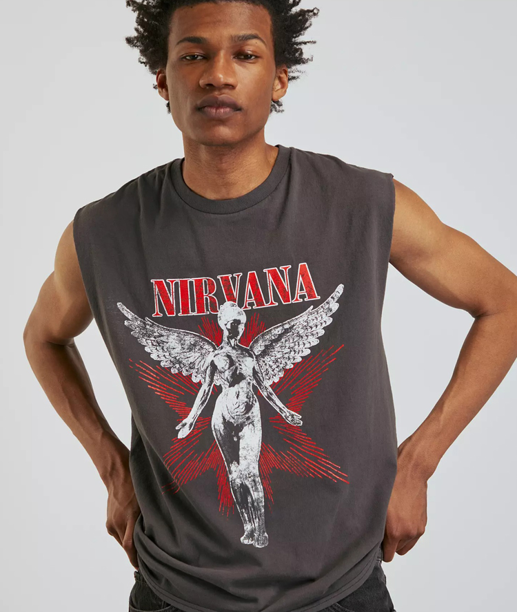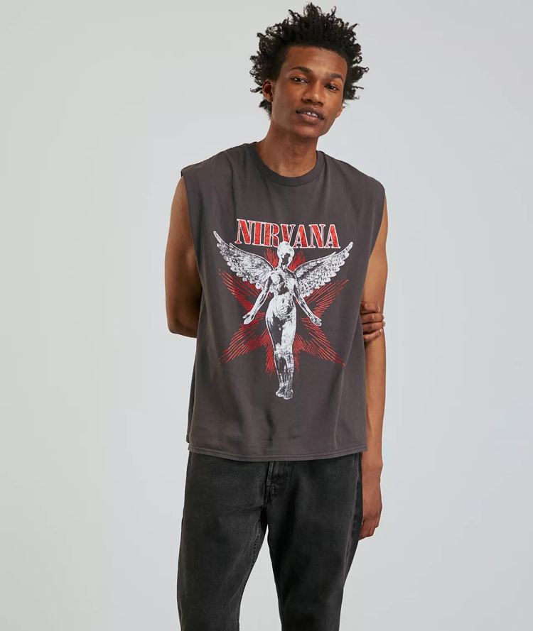 Sleeveless muscle tee topped with a Nirvana graphic printed at the front. Cut from 100% cotton and finished with a ribbed knit crew neck.